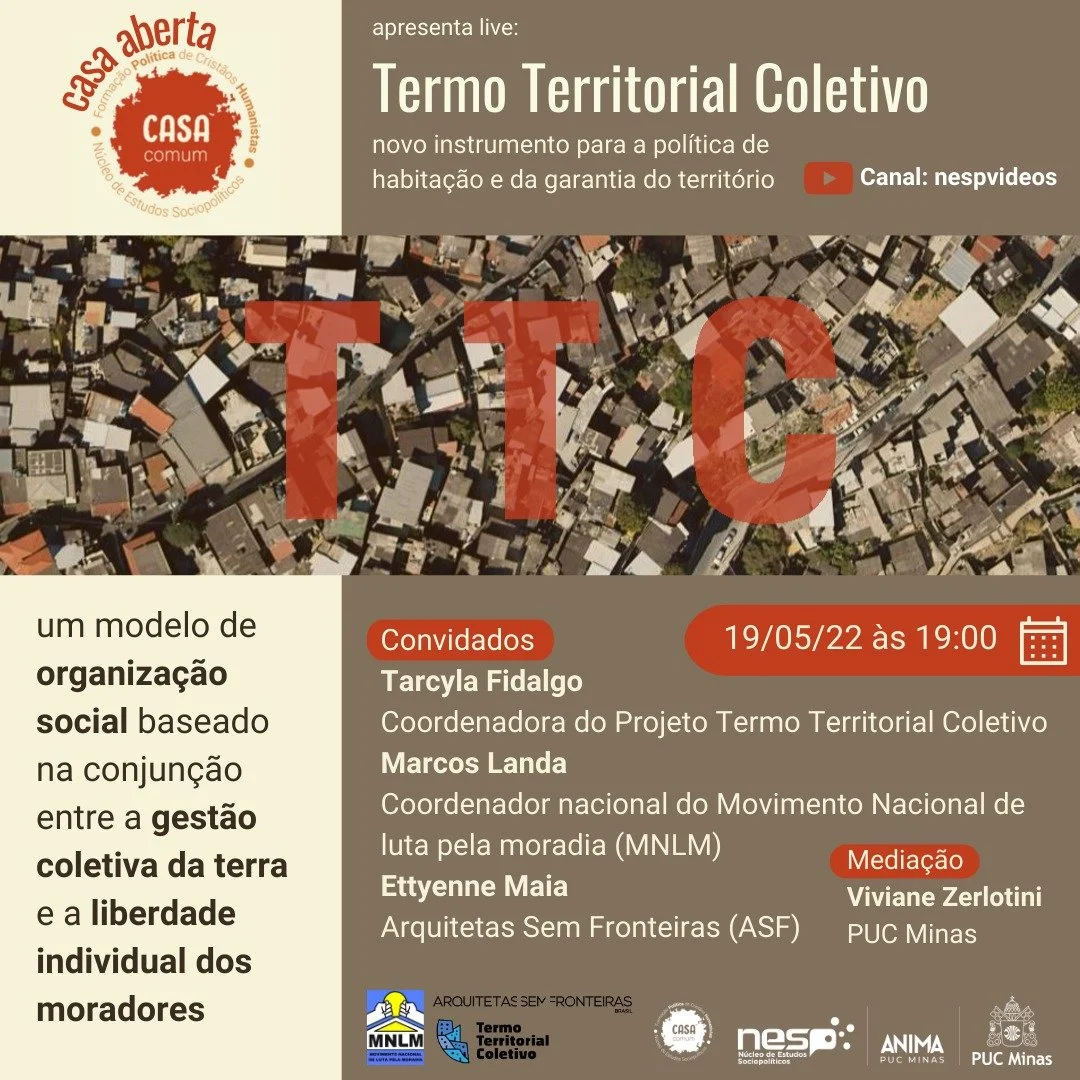 A LIVE “Termo Territorial Coletivo: novo instrumento para a política de habitação e garantia do território" foi. organizada pelo Movimento Nacional de Luta pela Moradia (MNLM - MG), em parceria com o coletivo Arquitetas sem Fronteiras e a PUC-Minas. Ela contou com um a apresentação de Tarcyla Fidalgo sobre o TTC.